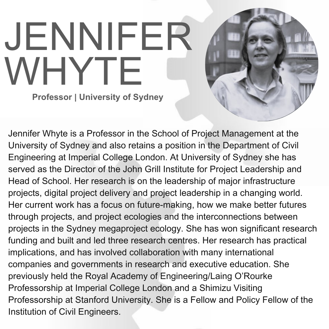 Professor Jennifer Whyte is Director of the John Grill Institute for Project Leadership and a Professor in the School of Project Management, in the Faculty of Engineering at the University of Sydney. She leads research on the leadership of major projects, and on project leadership in a changing world.