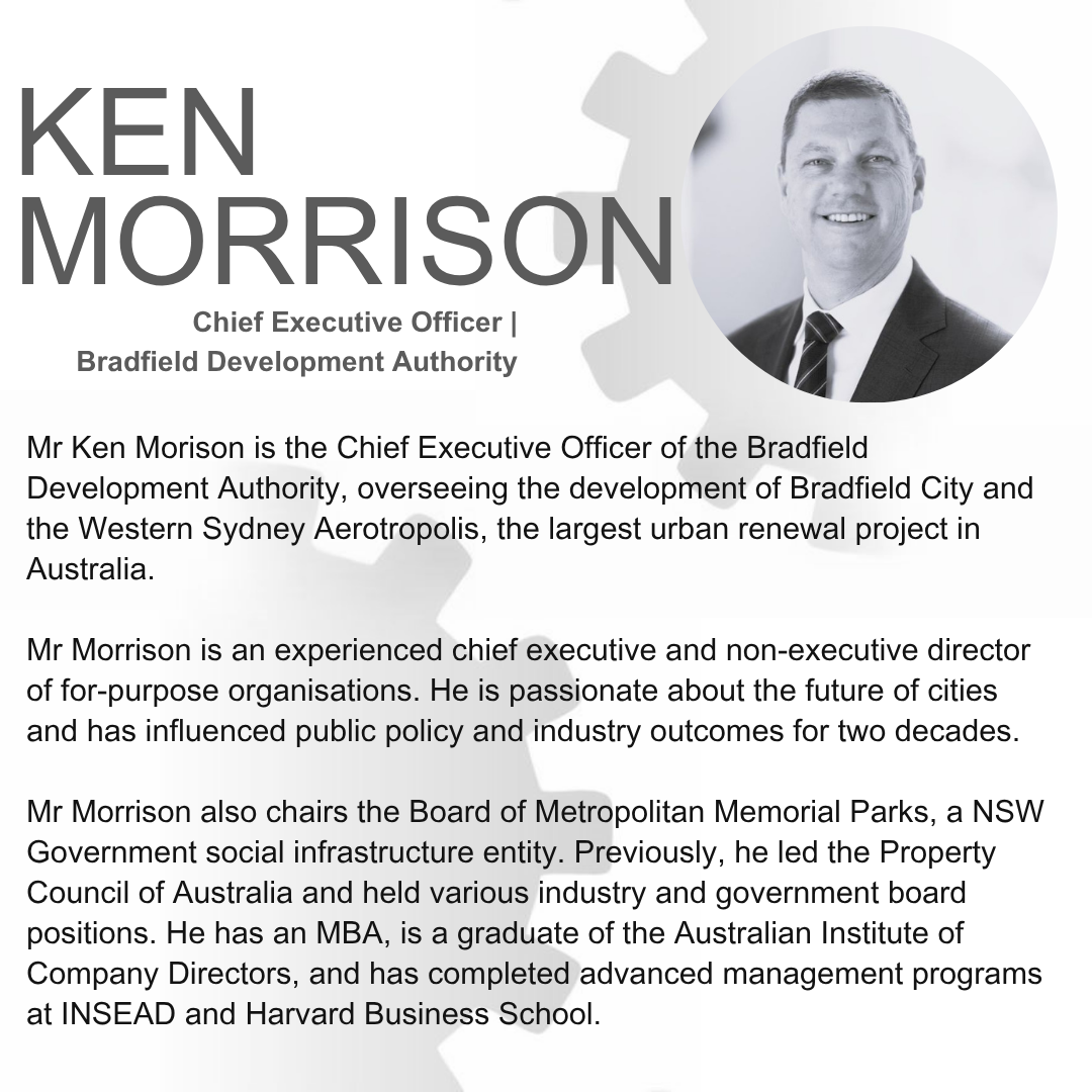 Mr Ken Morison is the Chief Executive Officer of the Bradfield Development Authority, overseeing the development of Bradfield City and the Western Sydney Aerotropolis, the largest urban renewal project in Australia.