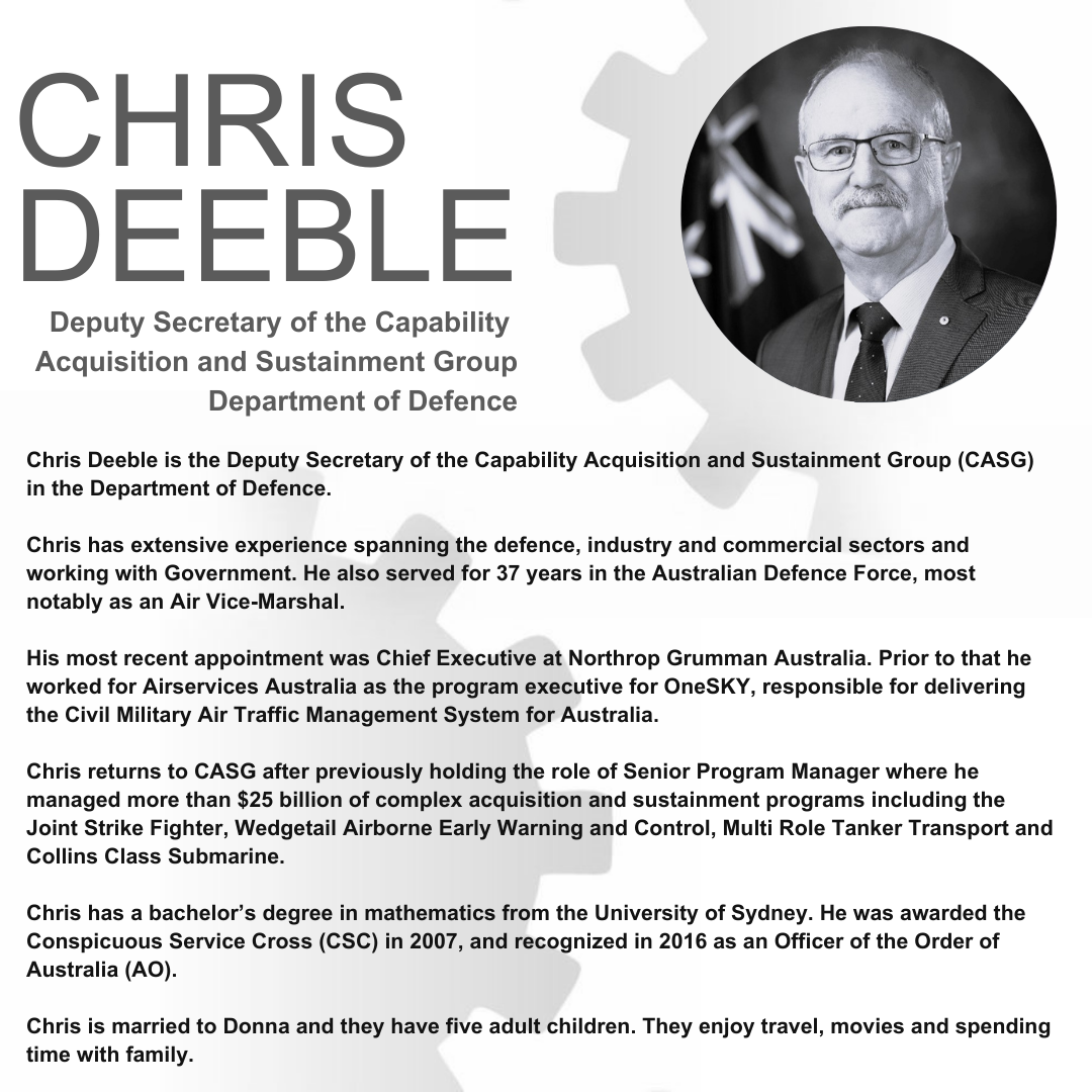 Chris Deeble is the Deputy Secretary of the Capability Acquisition and Sustainment Group (CASG) in the Department of Defence. Chris has extensive experience spanning the defence, industry and commercial sectors and working with Government.