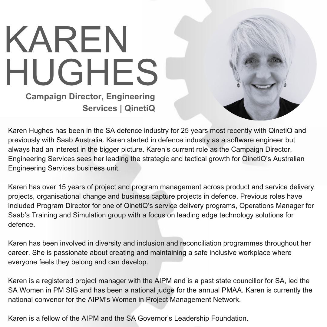 Karen Hughes has been in the SA defence industry for 25 years most recently with QinetiQ and previously with Saab Australia. Karen started in defence industry as a software engineer but always had an interest in the bigger picture.