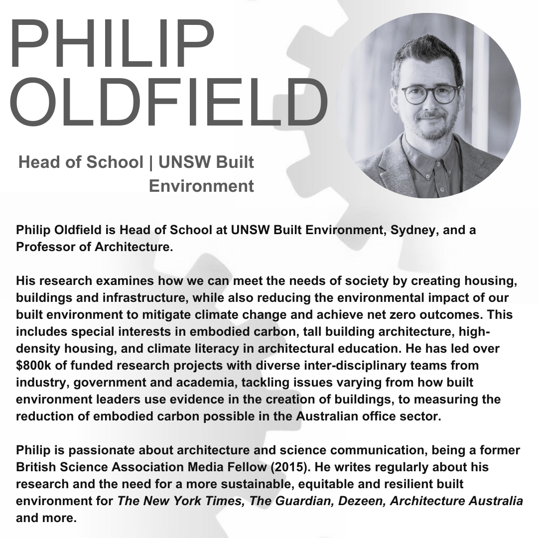 Philip Oldfield is Head of School at UNSW Built Environment, Sydney. His research examines how we can meet the needs of society by creating housing, buildings and infrastructure, while also reducing the environmental impact of our built environment to mitigate climate change and achieve net zero outcomes.
