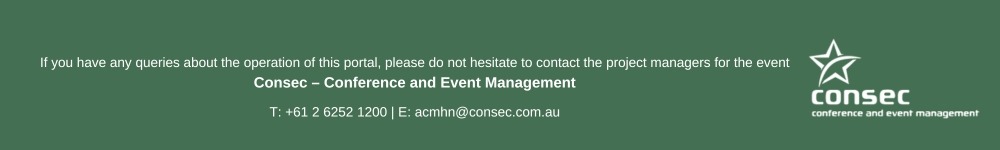 All registrations must be paid for using a valid credit card. If you have any questions, please email Consec – Conference and Event Management at acmhn@consec.com.au