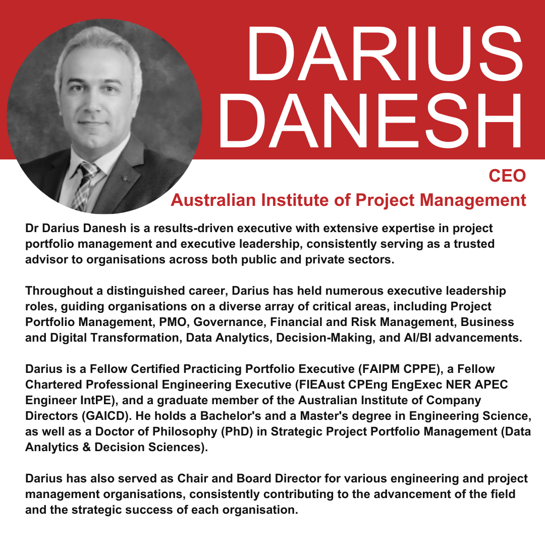 Dr Darius Danesh is a results-driven executive with extensive expertise in project portfolio management and executive leadership, consistently serving as a trusted advisor to organisations across both public and private sectors. Throughout a distinguished career, Darius has held numerous executive leadership roles, guiding organisations on a diverse array of critical areas.