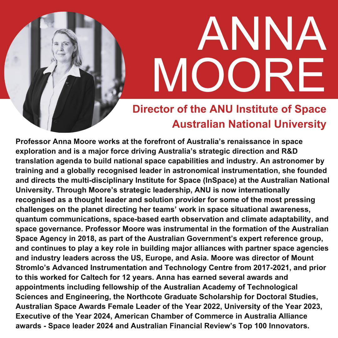 Professor Anna Moore works at the forefront of Australia’s renaissance in space exploration and is a major force driving Australia’s strategic direction and R&D translation agenda to build national space capabilities and industry. An astronomer by training and a globally recognised leader in astronomical instrumentation, she founded and directs the multi-disciplinary Institute for Space (InSpace) at the Australian National University.
