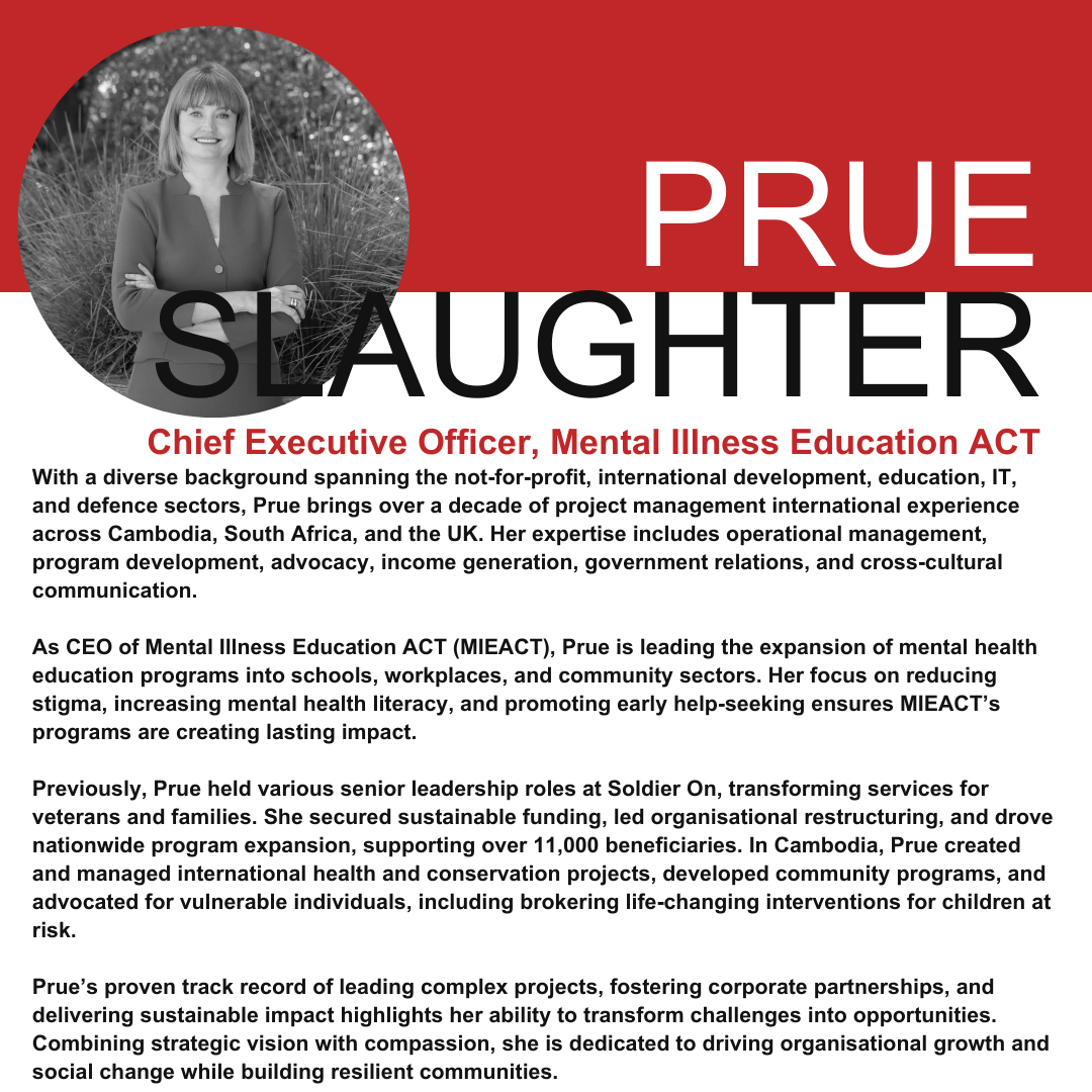 Prue's career is defined by her passion for driving positive change in communities and organisations through dynamic and strategic leadership. As CEO of Mental Illness Education ACT (MIEACT), Prue is leading the expansion of mental health education programs into schools, workplaces, and community sectors.