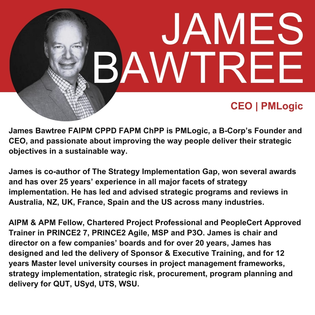 James Bawtree FAIPM CPPD FAPM ChPP is PMLogic, a B-Corp’s Founder and CEO, and passionate about improving the way people deliver their strategic objectives in a sustainable way. James is co-author of The Strategy Implementation Gap, won several awards and has over 25 years’ experience in all major facets of strategy implementation.
