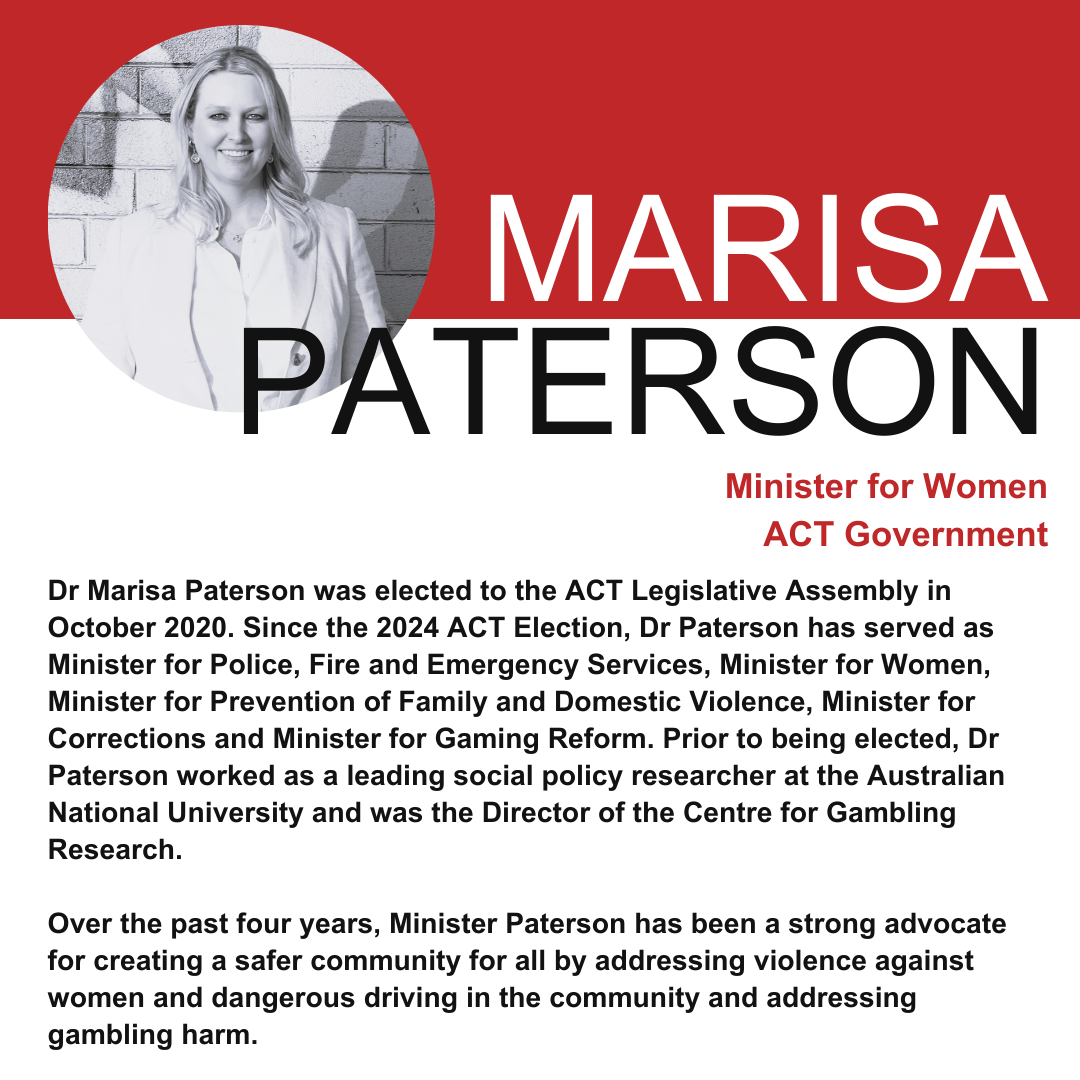 Dr Marisa Paterson was elected to the ACT Legislative Assembly in October 2020. Since the 2024 ACT Election, Dr Paterson has served as Minister for Police, Fire and Emergency Services, Minister for Women, Minister for Prevention of Family and Domestic Violence, Minister for Corrections and Minister for Gaming Reform.