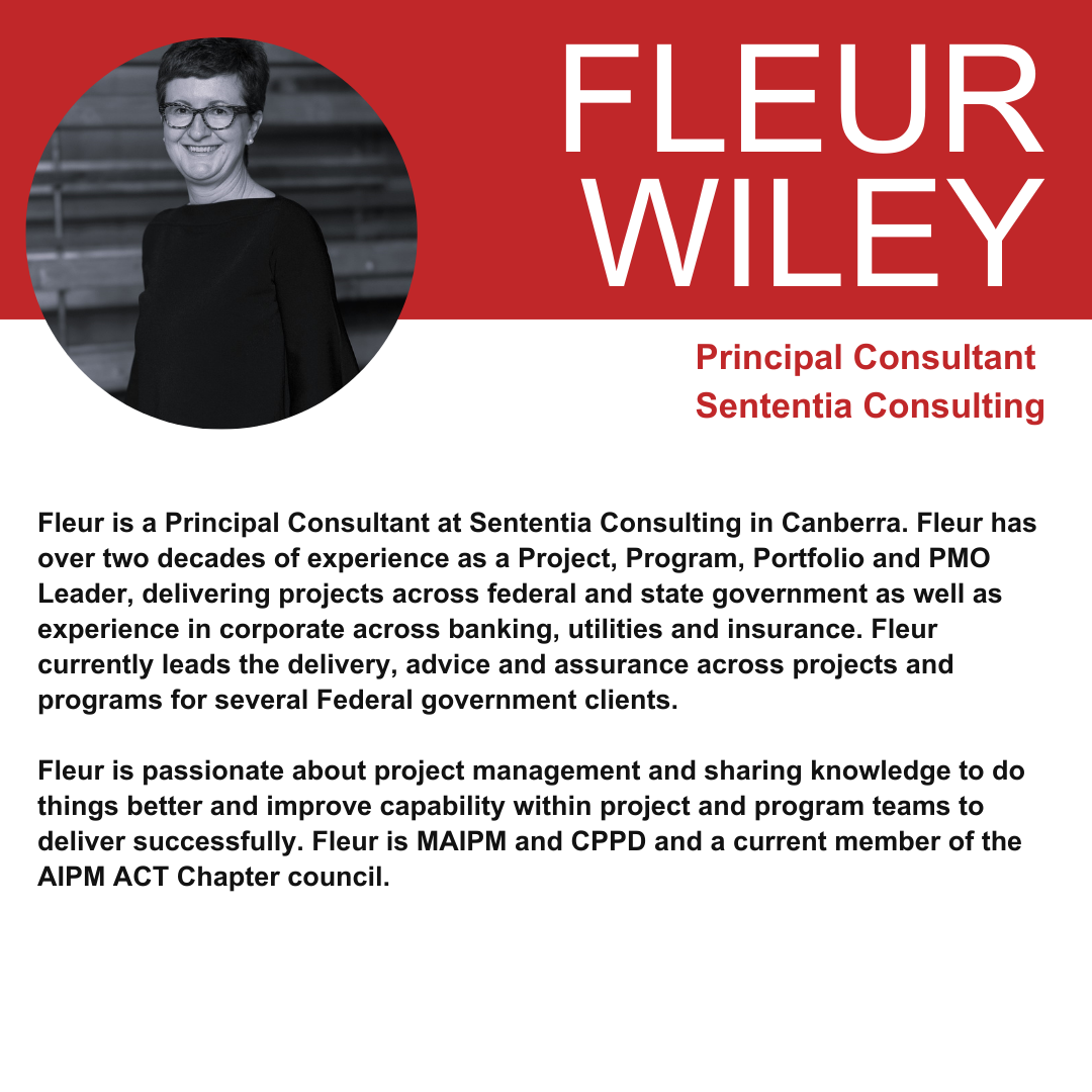 Fleur is a Principal Consultant at Sententia Consulting in Canberra. She has over two decades of experience as a Project, Program, Portfolio and PMO Leader, delivering projects across federal and state government as well as experience in corporate across banking, utilities and insurance.