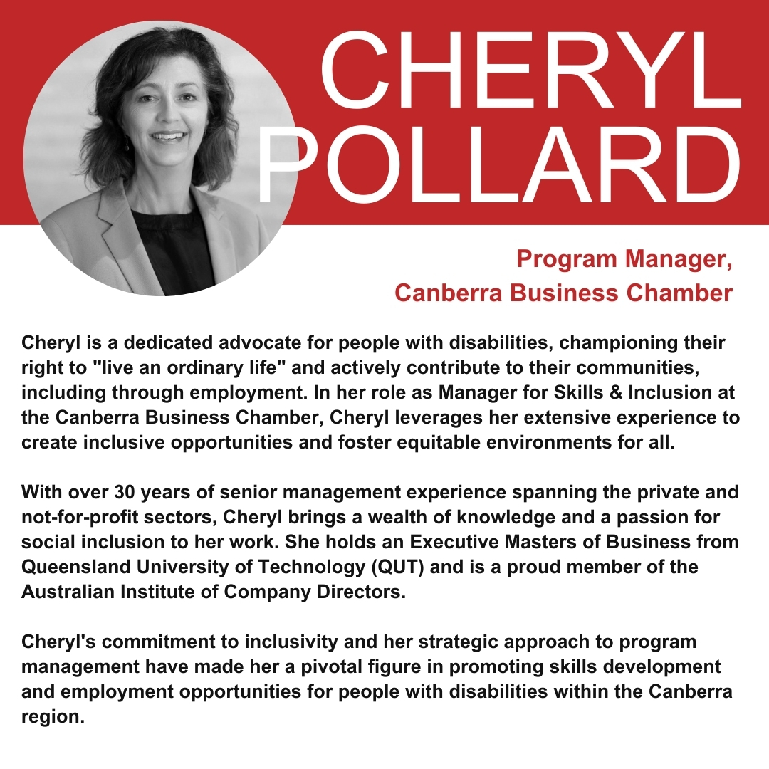 Cheryl is a dedicated advocate for people with disabilities, championing their right to "live an ordinary life" and actively contribute to their communities, including through employment. In her role as Manager for Skills & Inclusion at the Canberra Business Chamber, Cheryl leverages her extensive experience to create inclusive opportunities and foster equitable environments for all.
