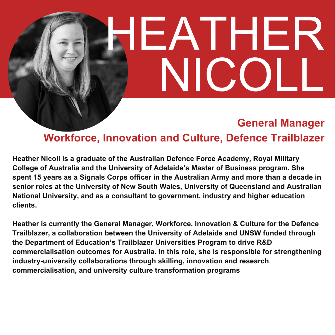 Heather Nicoll is a graduate of the Australian Defence Force Academy, Royal Military College of Australia and the University of Adelaide’s Master of Business program. She spent 15 years as a Signals Corps officer in the Australian Army and more than a decade in senior roles at UNSW, UOQ and ANU, and as a consultant to government, industry and higher education clients.