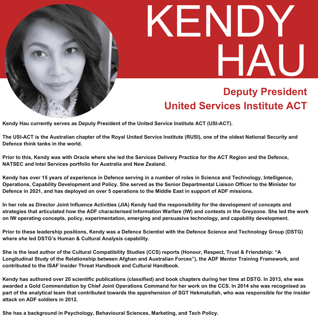Kendy Hau currently serves as Deputy President of the United Service Institute ACT (USI-ACT).