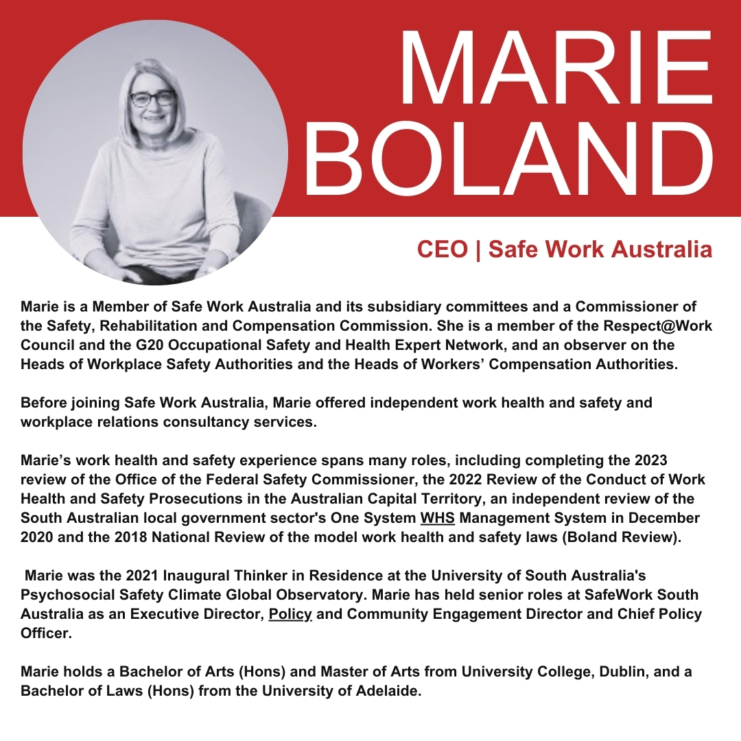 Marie is a Member of Safe Work Australia and its subsidiary committees and a Commissioner of the Safety, Rehabilitation and Compensation Commission. She is a member of the Respect@Work Council and the G20 Occupational Safety and Health Expert Network, and an observer on the Heads of Workplace Safety Authorities and the Heads of Workers’ Compensation Authorities.