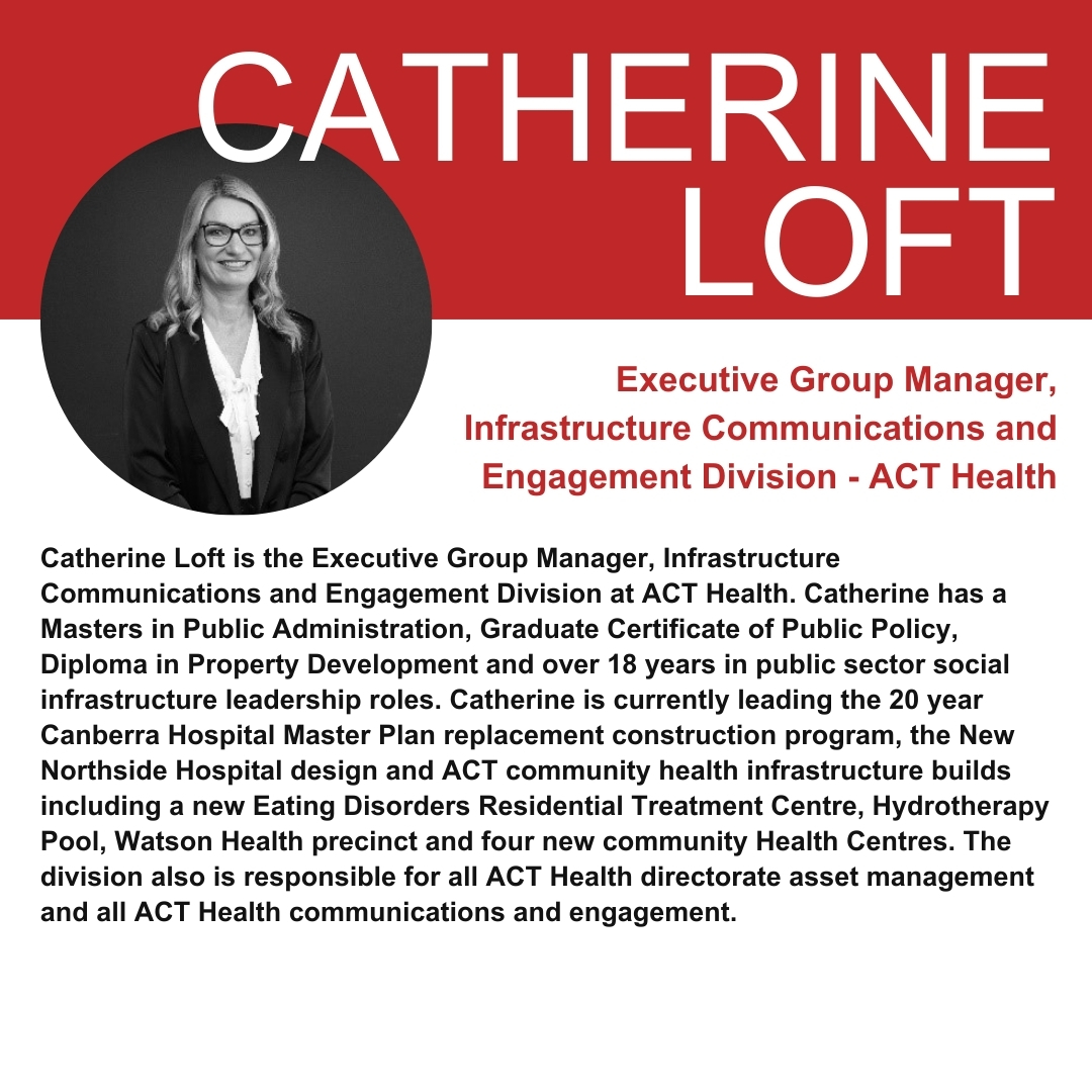 Catherine Loft is the Executive Group Manager, Infrastructure Communications and Engagement Division at ACT Health. Catherine has a Masters in Public Administration, Graduate Certificate of Public Policy, Diploma in Property Development and over 18 years in public sector social infrastructure leadership roles.