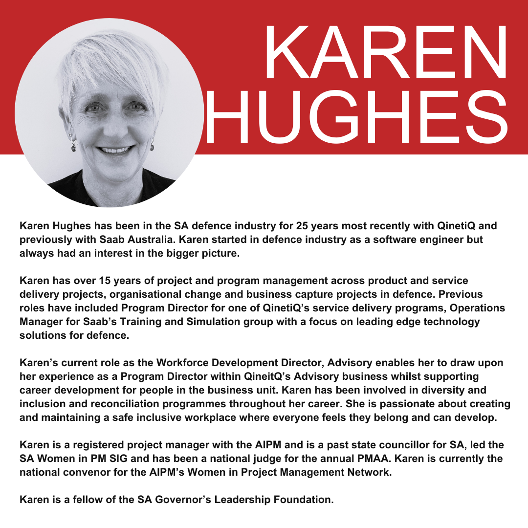 Karen Hughes has been in the SA defence industry for 25 years most recently with QinetiQ and previously with Saab Australia. Karen started in defence industry as a software engineer but always had an interest in the bigger picture.