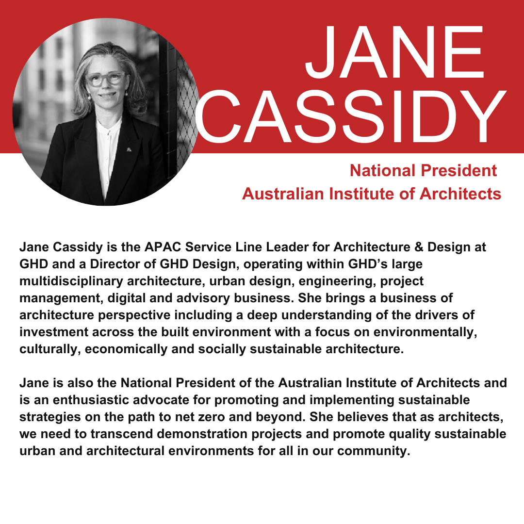 Jane Cassidy is the APAC Service Line Leader for Architecture & Design at GHD and a Director of GHD Design, operating within GHD’s large multidisciplinary architecture, urban design, engineering, project management, digital and advisory business. She is also the National President of the Australian Institute of Architects and is an enthusiastic advocate for promoting and implementing sustainable strategies on the path to net zero and beyond.