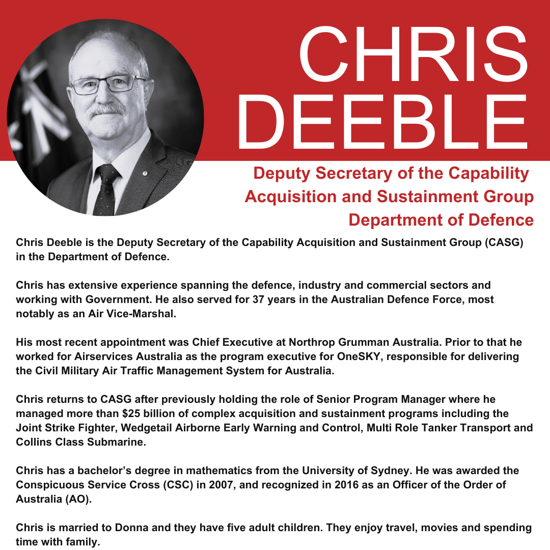 Chris Deeble is the Deputy Secretary of the Capability Acquisition and Sustainment Group (CASG) in the Department of Defence. Chris has extensive experience spanning the defence, industry and commercial sectors and working with Government. He also served for 37 years in the Australian Defence Force, most notably as an Air Vice-Marshal.