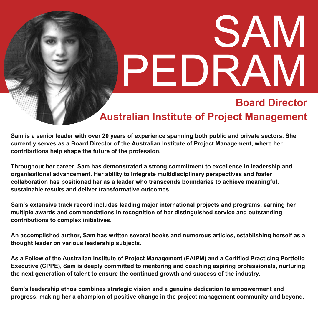 Sam is a senior leader with over 20 years of experience spanning both public and private sectors. She currently serves as a Board Director of the Australian Institute of Project Management, where her contributions help shape the future of the profession. Throughout her career, Sam has demonstrated a strong commitment to excellence in leadership and organisational advancement.